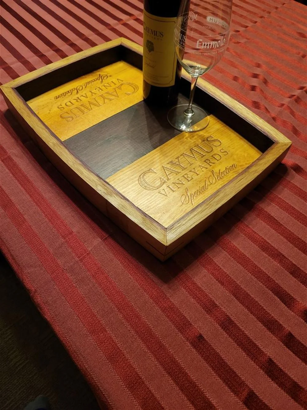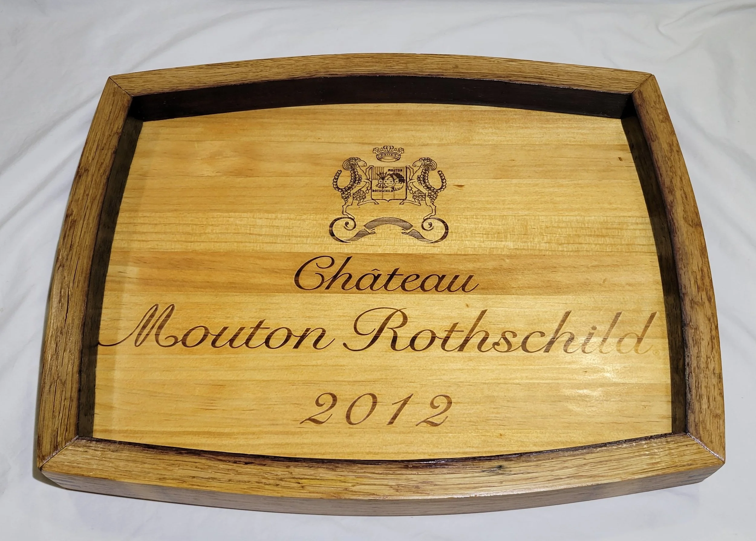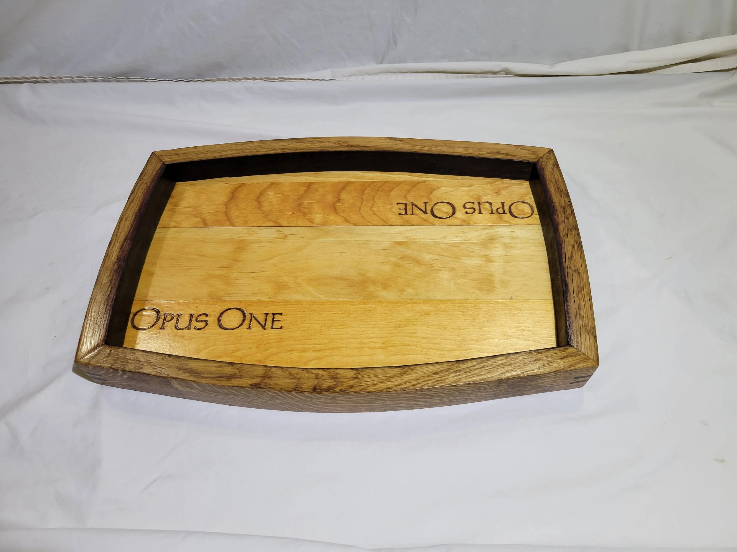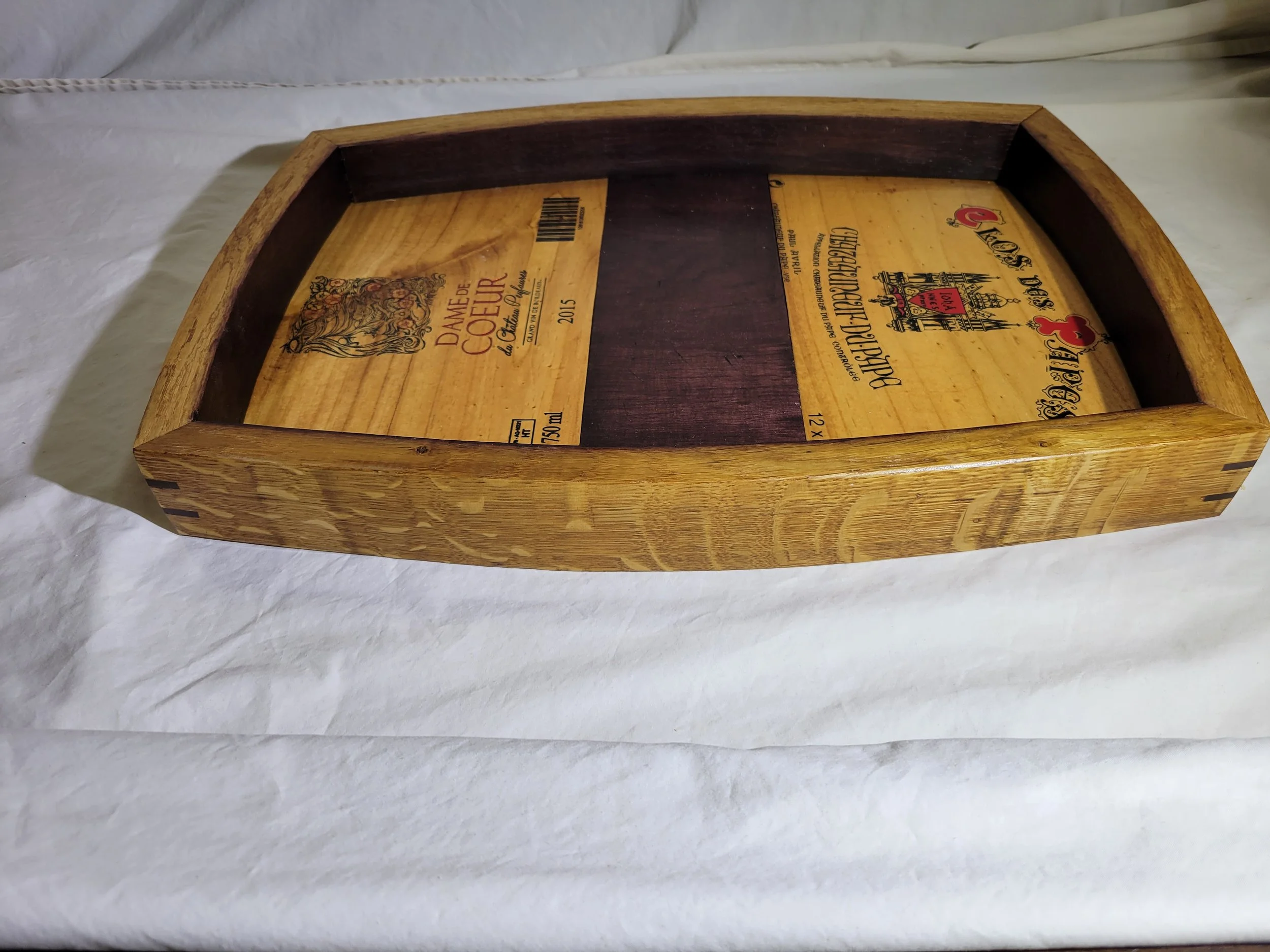 Each tray is made of 4 wine staves with mitered corners and wine crate lids or side panels. The dimensions can vary from tray to tray but are close to 12 x 18 x 2
